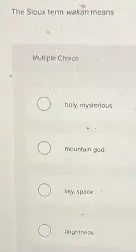 The Sioux term wakan means Multiple Choice holy, mysterious. mountain god. sky, space. brightness.