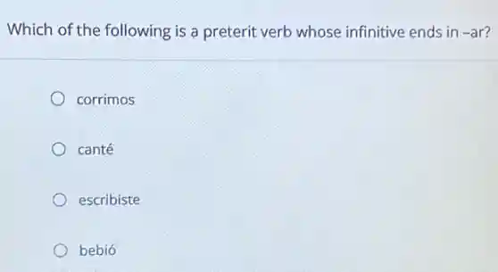Which of the following is a preterit verb whose infinitive ends in -ar corrimos canté escribiste bebió