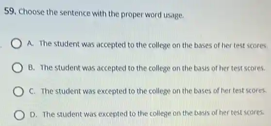 59. Choose the sentence with the proper word usage. A. The student was accepted to the college on the bases of her test scores. B. The student was accepted to the college on the basis of her test scores. C. The student was excepted to the college on the bases of her test scores. D. The student was excepted to the college on the basis of her test scores.