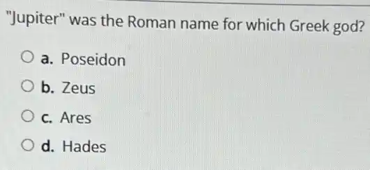 "Jupiter" was the Roman name for which Greek god? a. Poseidon b. Zeus c. Ares d. Hades