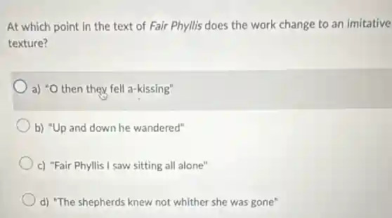 At which point in the text of Fair Phyllis does the work change to an imitative texture? a) "O then they fell a-kissing" b) "Up and down he wandered" c) "Fair Phyllis I saw sitting all alone" d) "The shepherds knew not whither she was gone"