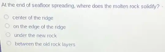 At the end of seafloor spreading, where does the molten rock solidify? center of the ridge on the edge of the ridge under the new rock between the old rock layers