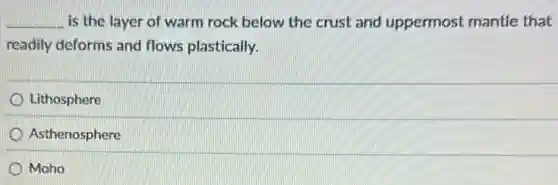 __ is the layer of warm rock below the crust and uppermost mantle that readily deforms and flows plastically. Lithosphere Asthenosphere Moho