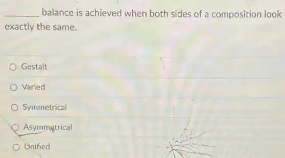 __ balance is achieved when both sides of a composition look exactly the same. Gestalt ) Varied Symmetrical Asymmetrical Unified