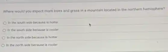 Where would you expect more trees and grass in a mountain located in the northern hemisphere? In the south side because is hotter In the south side because is cooler In the north side because is hotter In the north side because is cooler