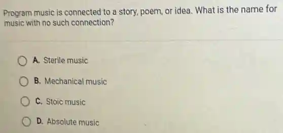 Program music is connected to a story, poem, or idea. What is the name for music with no such connection? A. Sterile music B. Mechanica I music C. Stoic music D. Absolute music