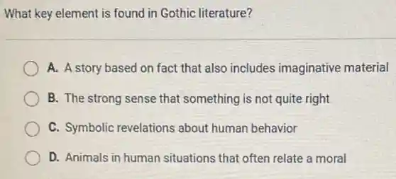 What key element is found in Gothic literature? A. A story based on fact that also includes imaginative material B. The strong sense that something is not quite right C. Symbolic revelations about human behavior D. Animals in human situations that often relate a moral