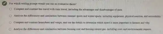 For which writing prompt would you use an evaluative thesis? Compare and contrast bus travel with train travel.including the advantages and disadvantages of each. Analyze the differences and similarities between summer sports and winter sports,including equipment, physical exertion, and accessibility. Compare and contrast honeybees and wasps, and use the details to determine which insect is more important to farmers and why. Analyze the differences and similarities between burning coal and burning natural gas including costs and environmental impacts.