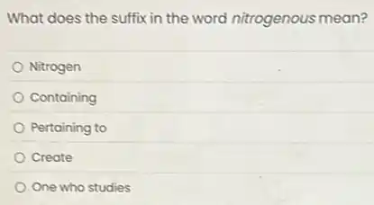 What does the suffix in the word nitrogenous mean? Nitrogen Containing Pertaining to Create One who studies