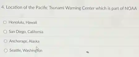 4. Location of the Pacific Tsunami Warning Center which is part of NOAA Honolulu, Hawaii San Diego, California Anchorage, Alaska Seattle, Washington