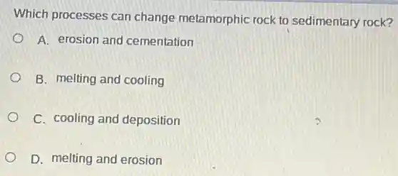 Which processes can change metamorphic rock to sedimentary rock? A. erosion and cementation B. melting and cooling C. cooling and deposition D. melting and erosion