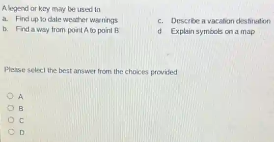 A legend or key may be used to a. Find up to date weather warnings c. Describe a vacation destination b. Find a way from point A to point B d Explain symbols on a map Please select the best answer from the choices provided A B C D