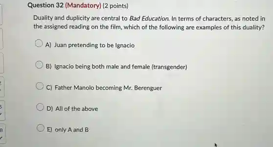 Question 32 (Mandatory) (2 points) Duality and duplicity are central to Bad Education. In terms of characters, as noted in the assigned reading on the film, which of the following are examples of this duality? A) Juan pretending to be Ignacio B) Ignacio being both male and female (transgender) C) Father Manolo becoming Mr.Berenguer D) All of the above E) only A and B