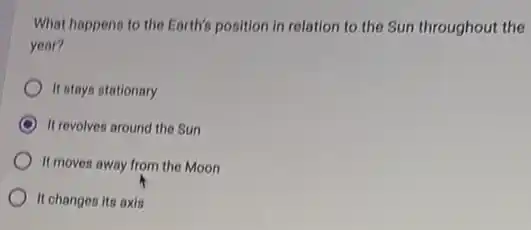 What happens to the Earth's position in relation to the Sun throughout the year? It stays stationary It revolves around the Sun It moves away from the Moon It changes its axis