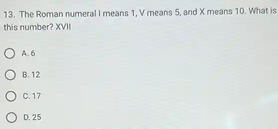 13. The Roman numeral I means 1 V means 5, and X means 10. What is this number? XVII A. 6 B. 12 C. 17 D. 25