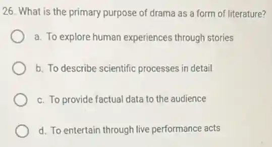 26. What is the primary purpose of drama as a form of literature? a. To explore human experiences through stories b. To describe scientific processes in detail c. To provide factual data to the audience d. To entertain through live performance acts